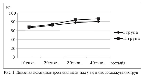 При включенні у дослідження вагітних із терміном гестації 12 тижнів середня вага у жінок І групи досягла значень 66,51±5,43 кг, у ІІ — 68,42±5,56 кг. Дані показники були співставимі і не мали значущої різниці (p>0,05). Під час другого дослідження (24 тижні) цей показник становив 5,05±0,8 і 5,7±1,4 кг відповідно, що мало значущі відмінності (p=0,001). Найбільш вагомі відмінності у середніх показниках приросту маси тіла були зафіксовані під час третього дослідження (36 тижнів) і склали 6,65±1,87 кг у І групі та 10,25±2,68 кг — у ІІ (р=0,00). Приріст ваги протягом останніх тижнів вагітності не мав відмінностей і склав 2,7±0,68 і 2,8±0,8 кг відповідно (р=0,63). Загальний приріст ваги, починаючи з 12-ти тижнів гестації, склав 14,5±2,94 і 18,7±2,82 кг (p=0,00).