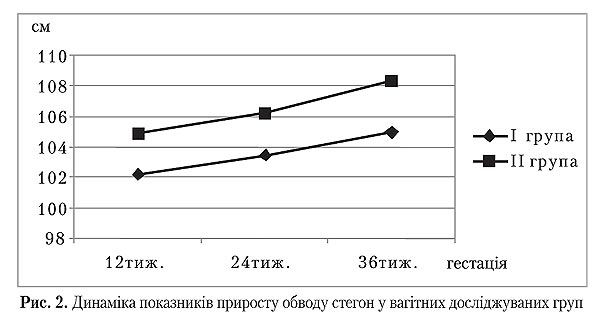 Під час залучення жінок у дослідження у терміні вагітності 12 тижнів середні показники обводу стегон становили в І групі 99,28±4,22 см, а в ІІ — 100,38 ±1,94 см, тобто не мали значущої різниці (p>0,05). Під час другого дослідження (24 тижні) приріст обводу стегон у І і ІІ группах склав 4,47±2,76 і 2,91±1,01 см відповідно, що мало значущі відмінності (p=0,003). Згодом значущих відмінностей у середніх показниках приросту обводу стегон під час третього дослідження (36 тижнів) та напередодні пологів (p>0,05) відмічено не було.