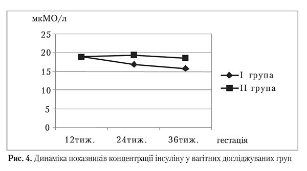 У терміні вагітності 12 тижнів жінки обох груп були подібними за концентрацією інсуліну (р>0,05). Під час усього подальшого спостереження між І і ІІ групами фіксувалися значущі відмінності середніх показників його концентрації (р=0,00). У ІІ групі спостерігалася незначна, проте стабільна тенденція до зростання вмісту інсуліну, що може свідчити про збільшення потреби в інсуліні через фізіологічне зменшення чутливості до його дії у периферичних тканинах. Навіть після поступового відновлення рівня інсуліну наприкінці вагітності, що відповідає фізіологічним механізмам її перебігу, середні значення рівня інсуліну мають достовірно значимі відмінності між групами.