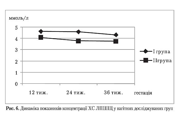 На початку дослідження у терміні вагітності 12 тижнів жінки обох груп були подібними за вмістом загального холестерину та ХС ЛПНЩ (р>0,05). Під час усього подальшого спостереження між І і ІІ групами фіксувалися відмінності їх середніх значень (р<0,05), що дозволило прослідкувати рівномірне зниження вмісту загального холестерину та ХС ЛПНЩ в обох групах протягом усього періоду спостереження. Проте зниження концентрації загального холестерину у ІІ групі наприкінці вагітності корелювавло зі зниженням тощакового інсуліну і глікемії, що були представлені раніше.