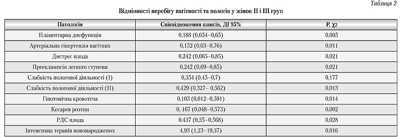 Порівняльний аналіз перебігу вагітності та пологів, а також лабораторних та антропометричних даних у пацієнток ІІ і ІІІ груп підтвердив результати когортного дослідження, що інсулінорезистентність в ранніх термінах гестації є незалежним фактором негативного впливу на соматичний та акушерський статус вагітних жінок (табл. 2).
