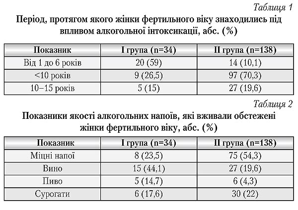 Аналіз отриманих результатів проведеного дослідження показав, що в популяції жінок фертильного віку було 172 жінки, які знаходились під впливом алкогольної інтоксикації. Було з'ясовано, що 138 (80,2%) жінок з проблемою вживання алкоголю зверталися в наркологічні лікарські заклади м. Києва, але були і такі, які в медичні заклади не зверталися, а виявлені нами вперше. Усі жінки, які знаходились під впливом алкогольної інтоксикації, були розподілені на 2 групи: І — 34 (19,7%) пацієнтки з гострою алкогольною інтоксикацією, ІІ — 138 (17,3%) хворих з хронічною алкогольною інтоксикацією.