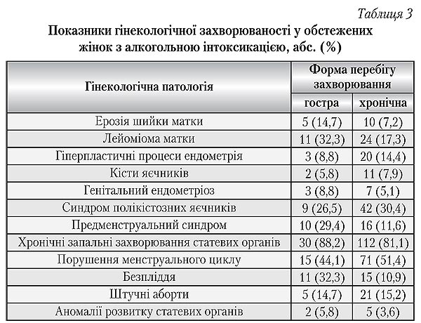 Із наведених в табл. 4 даних видно, що у жінок, які знаходяться під впливом алкогольної інтоксикації, спостерігаються різні порушення репродуктивного здоров'я.