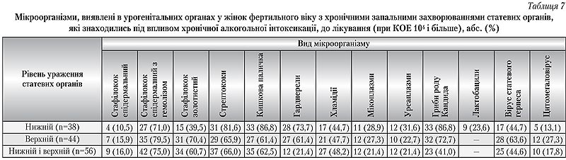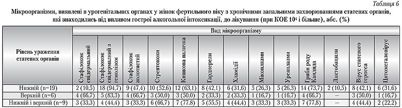 У групі жінок з хронічною алкогольною інтоксикацією були виявлені такі асоціації мікроорганізмів, що найчастіше зустрічалися при нижньому рівні ураження статевих органів: перший варіант — стафілокок епідермальний з гемолізом, стрептококи, гарднерели, гриби роду Кандида, другий варіант — стафілокок золотистий, кишечна паличка, гриби роду Кандида, третій — асоціація кишко вої палички, грибів роду Кандида та вірусу статевого герпеса. При верхньому рівні ураження найчастіше спостерігались: перший варіант — асоціації стафілокока епідермального з гемолізом, стафілокока золотистого, стрептокока, грибів роду Кандида, другий — асоціація кишкової палички, хламідій, мікоплазм та вірусу статевого герпеса, третій — асоціація хламідій, грибів роду Кандида і вірусу статевого герпеса. При комбінації верхнього і нижнього рівнів ураження статевих органів найбільш часто зустрічались такі варіанти мікробних асоціацій: перший - стафілокок епідермальний з гемолізом, стафілокок золотистий, стрептокок, гриби роду Кандида, другий — кишкова паличка, хламідії, гриби роду Кандида, третій — гриби роду Кандида і вірус статевого герпеса.
