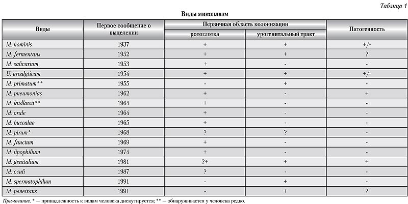 Согласно современной таксономии (Berqey, 1984) микоплазмы входят в класс Mollicutes, который подразделяется на порядок — Mycoplasmatales, семейство — Mycoplasmataceae и 2 рода — Mycoplasma и Ureaplasma, включающие 15 видов микоплазм, для которых человек является естественным хозяином (табл. 1) [14, 15, 41].