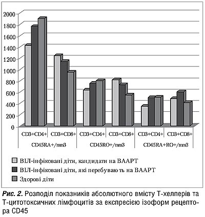 Виявлені відсоткові показники лімфоцитів, які одночасно несли на своїй поверхні обидві ізоформи рецептора CD45, відбивають перебіг процесів утворення клітин пам'яті з наївних Т-лімфоцитів — у ВІЛ-інфікованих дітей існувало порушення утворення Т-цитотоксичних лімфоцитів пам'яті порівняно із здоровими дітьми. Розподіл показників абсолютного вмісту Т-хелперів та Т-цитотоксичних лімфоцитів за експресією ізоформ рецептора CD45 дав наступні результати (рис.2).