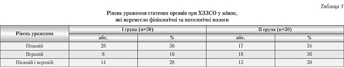 Особливості ураження статевих органів у жінок з ХЗЗСО, які перенесли фізіологічні та патологічні пологи, представлені в таблиці 1.