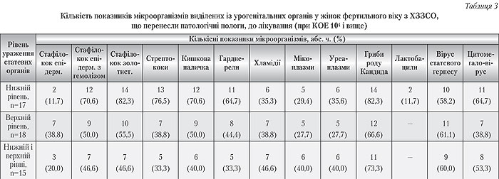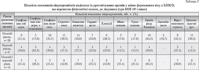 При верхньому рівні ураження статевих органів найчастіше спостерігалися наступні варіанти мікробних асоціацій: перший варіант — стафілокок золотистий, кишкова паличка, гриби роду Кандида;