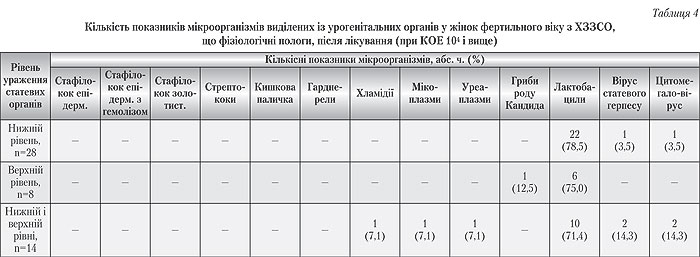 Отримані після лікування дані стану мікробіоценозу урогенітальних органів на 7–10 добу після закінчення лікування представлені в таблицях 4, 5. Стан мікробіоценозу урогенітальних органів після лікування максимально наближався до нормальних показників, що свідчить про ефективність проведених лікувальних заходів.