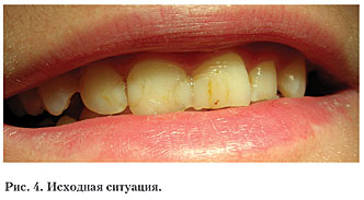 Пациентка М., 24 года, обратилась с жалобами на эстетический дефект верхних фронтальных зубов. При визуальном осмотре обнаружено: на медиально-аппроксимальной поверхности 12 и 22-го зубов, а также на обеих аппроксимальных поверхностях 11 и 21-го зубов композитные пломбы, краевое прилегание нарушено. Отмечается пигментация по краю пломб и развитие вторичного кариеса (рис. 4).