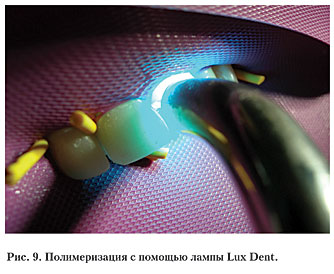 При пломбировании полостей на контактных поверхностях были использованы тонкие матрицы и клинья. В подготовленные полости апплицировали порции композита Synergy D6 дентинного оттенка А2/B2, проводили адаптацию соответствующим инструментом и полимеризовали на протяжении 20 сек. В случае использования полимеризационных ламп мощностью менее 800 mW/см2 время полимеризации должно быть увеличено до 40 сек (рис. 9).