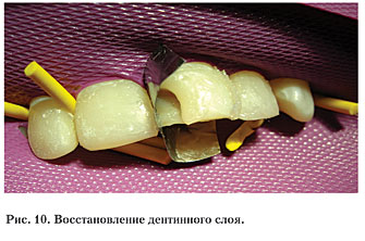 Материал не рекомендуется наносить слоем толщиной более 2 мм (рис. 10). После восстановления дентинного слоя апплицировали эмалевый оттенок Enamel Universal, который полимеризовали на протяжении 20 сек. Ближе к режущему краю наносили оттенок эмали Enamel White Opalescent. Последний слой материала полимеризовали на протяжении 60 сек.