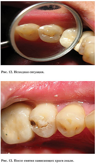 Пациент С., 34 года, обратился в клинику с жалобами на застревание пищи в 35-м зубе (рис. 12). При визуальном осмотре выявлено: на дистально-аппроксимальной поверхности 35-го зуба кариозная полость с узким входным отверстием. После снятия нависающих краев эмали обнаружено: полость в пределах плащевого дентина, дно и стенки заполнены размягченным пигментированным дентином, зондирование по эмалево-дентинной границе болезненно, дна полости – безболезненно (рис. 13). Перкуссия 35-го зуба безболезненна, слизистая оболочка в области 35-го зуба без видимых патологических изменений.