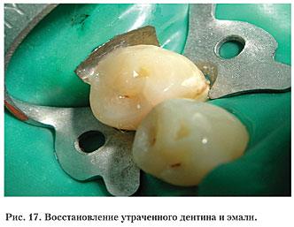 В подготовленную полость апплицировали порцию композита Synergy D6 дентинного оттенка А3/B3, адаптировали его соответствующим инструментом и полимеризовали на протяжении 20 сек. После восстановления дентинного слоя апплицировали эмалевый оттенок Enamel Universal, который полимеризовали на протяжении 20 сек (рис. 17). Последний слой материала полимеризовали на протяжении 60 сек.