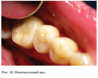Обработку и полировку пломбы проводили под охлаждением с помощью алмазных финиров с зернистостью от 40 до 15 µm [4, 5]. Для окончательной полировки использовали полиры Diatech (Coltène/Whaledent), полировочные диски и щеточки. В завершение зуб покрыли фторсодержащим лаком (рис. 18).
