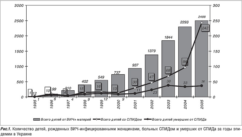 По данным Объединенной программы Организации Объединенных Наций (ООН) по ВИЧ/СПИДу (ЮНЭЙДС), Украина занимает одно из первых мест в Европе по темпам распространения ВИЧ-инфекции. Расчетный показатель распространенности ВИЧ-инфекции среди людей возрастной группы 15–49 лет составляет 1,48% и более 40% из них — женщины [5]. Развитие эпидемии в нашей стране негативно сказывается на демографических показателях и приводит к увеличению количества детей, рожденных ВИЧ'инфицированными женщинами; в 2007 г. их число превысило 17000 (рис. 1) [6].
