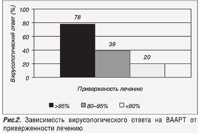 Приверженность лечению можно оценить прямыми методами, собирая и анализируя данные о соблюдении правил приема лекарств, полученные у пациента или его ближайшего окружения, а также путем подсчета количества выданных и оставшихся медикаментов. Приверженность лечению обычно расценивают как неудовлетворительную, когда пациент принимает менее 80% предписанных на продолжительный период доз каждого медикамента. При правильном приеме 96–100% доз препаратов приверженность считается хорошей. Опосредованными методами оценки приверженности лечению ВИЧ-инфекции являются динамика вирусной нагрузки в плазме крови, уровня СВ4+-лимфоцитов в крови и клинического состояния больного (заболеваемость оппортунистическими инфекциями, рост и развитие ребенка). На рисунке 2 представлены результаты исследования D.L. Paterson и соавт. (2001), которые демонстрируют положительное влияние хорошей приверженности лечению на динамику вирусной нагрузки у ВИЧ-инфицированных пациентов. По данным этого исследования, причиной развития резистентности (устойчивости) ВИЧ к первой схеме ВAAPT у 50% больных является плохая приверженность лечению [11].