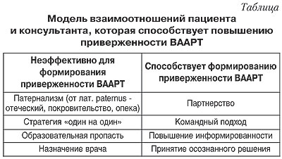 Формирование приверженности лечению — это обеспечение соответствующего поведения больного и лиц из ближайшего окружения, его питания и образа жизни, режима приема и хранения медикаментов, что способствует строгому соблюдению правильного лечения. Способствуют приверженности ВААРТ: вера в необходимость лечения и эффективность принимаемых медикаментов, понимание значимости соблюдения режима приема медикаментов, знание о возможных побочных эффектах и путях их преодоления, понимание взаимосвязи между приверженностью лечению и возможным развитием резистентности (устойчивости) вируса к АРВ-препаратам, удобный режим приема препаратов, приемлемые (для детей) лекарственные формы, возможность получить эмоциональную и практическую помощь консультанта, качественное медицинское наблюдение. Препятствуют приверженности ВААРТ: отсутствие доверия врачу, который проводит медицинское наблюдение; употребление наркотиков, алкоголизм, асоциальный образ жизни взрослых пациентов или родителей (опекунов) ВИЧ-инфицированных детей; психические заболевания в активной фазе (в том числе депрессия); плохой доступ к специализированной медицинской помощи и медикаментам; побочные эффекты препаратов; назначение большого количества медикаментов, сложные схемы лечения. По мнению М. Magee и соавт. (табл.), эффективная модель взаимоотношений пациента и специалиста-консультанта, которая способствует повышению приверженности ВААРТ, предусматривает создание партнерских доверительных взаимоотношений с пациентом, построенных на взаимном уважении [9]. Важным фактором успешного лечения ВИЧ-инфекции является внедрение командного (мультидисциплинарного) подхода, когда ведением пациента занимается команда специалистов, в которую входят врач, медицинская сестра и социальный работник, а также привлекаются другие специалисты (врачи других специальностей и не медицинские работники, например юрист).