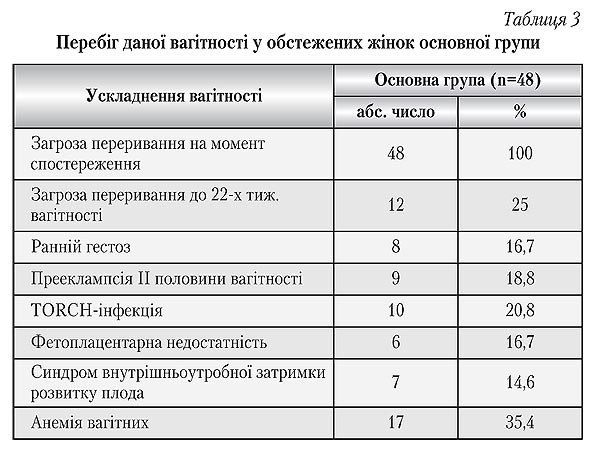 Так, загроза переривання вагітності на момент обстеження у кожної четвертої жінки носила рецидивуючий характер. Найчастішими ускладненнями даної вагітності були анемія вагітних — 17 (35,4%) випадків і TORCH-інфекція — 10 (28%). Звертає увагу несприятлива тенденція погіршення перебігу вагітності пропорційно строку гестації. Так, якщо на ранніх строках вагітність була ускладнена раннім гестозом у 8 (16,7%) пацієнток, то в більш пізніх строках вже 9 (18,8%) вагітних жінок основної групи страждали прееклампсією, яка погано піддавалася лікуванню на тлі фетоплацентарної недостатності і синдрому внутрішньоутробної затримки розвитку плода — 8 (16,7%) і 7 (14,6%) епізодів відповідно.