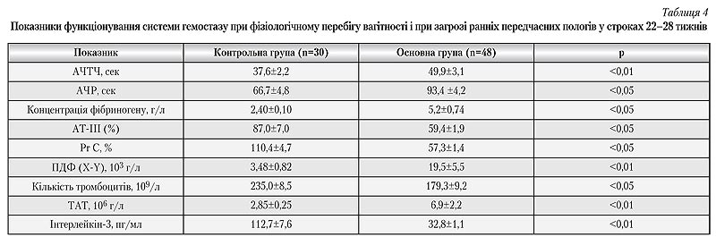 Аналіз отриманих клініко&лабораторних даних свідчить про значну частоту розвитку гемостазіологічних порушень у жінок із загрозою передчасного переривання вагітності. Найчастішими їх проявами були помірна тромбоцитопенія — 21 (45,7%) випадок, яка не супроводжувалася ознаками підвищеної кровоточивості, а також ангіопатія сітківки у кожної четвертої вагітної (12 випадків). Остання у більшості хворих була виявлена вперше, проявлялася в незначних змінах артерій очного дна і не супроводжувалася порушенням зору. Ці клінічні дані підтверджуються лабораторними показниками (табл. 4).